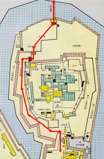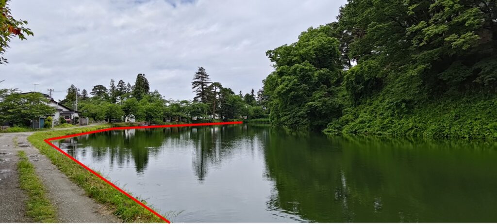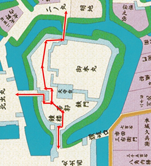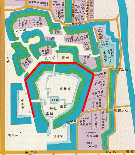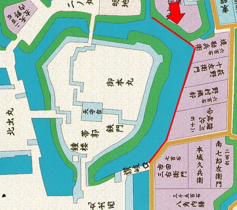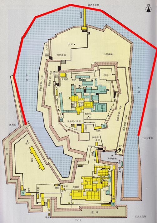 今度は二ノ丸側からです。絵図の赤色の矢印からの眺めですが、ここは豊臣大坂城本丸の堀の形状と酷似しており、豊臣大坂城でもこのような眺めだったと妄想してしまいます。