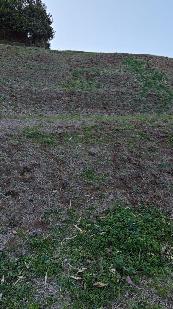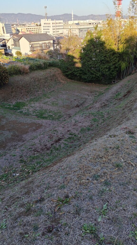 画像からは高低差が伝わりづらいですが、堀底までは現在でも7m近くあり、当時は10m以上あったと思われます(豊臣大坂城の南惣構の空堀は11m以上)。