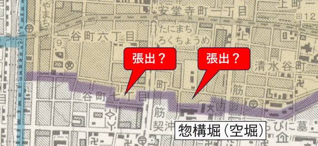 左側の張出(谷町口付近)については、以前、三ノ丸の記事で痕跡を含めてご紹介していますので、こちらを参照ください。