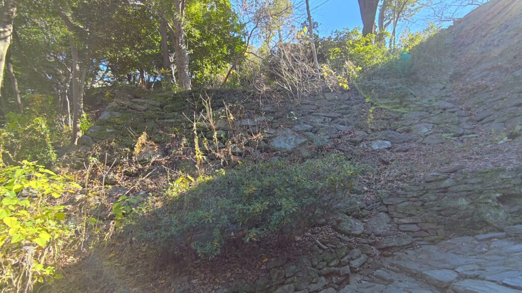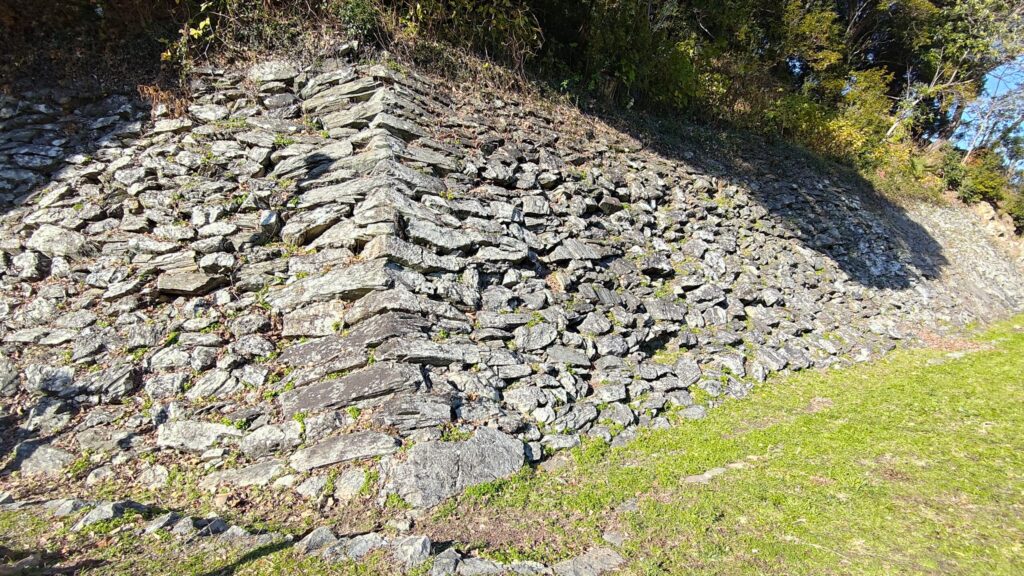 秀長が築いた石垣には「鎬(しのぎ)積み」が見られます。鎬積みとは、石垣の角度が90度以上の鈍角で積まれているものを言います。