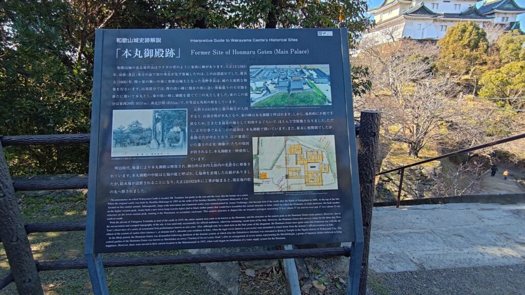 慶長5年(1600年)、関ヶ原の戦い後に和歌山城主となった浅野幸長は、城の大規模な修築を行います。山頂部分では、西の高い峰に現在の形に近い黒板張りの天守閣を新たに築いて本丸とし、東の低い峰に御殿を建てて二ノ丸としました。